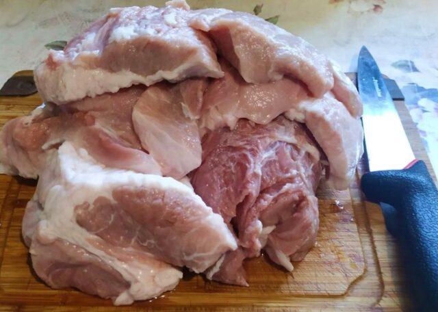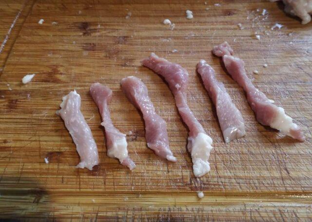 - Исеците свињетину на кришке дебљине 7-8 мм, а свака од њих, заузврат, на дугачке траке.