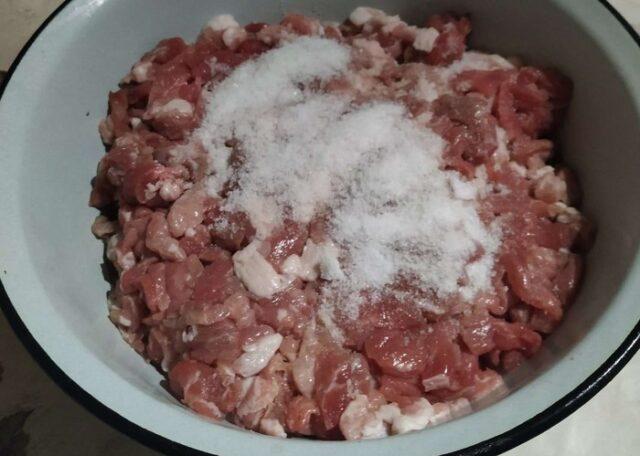 - У месо додајте натријум хлорид и нитрит, сол, воду, месите док се комади не „залепе“ у хомогену масу.