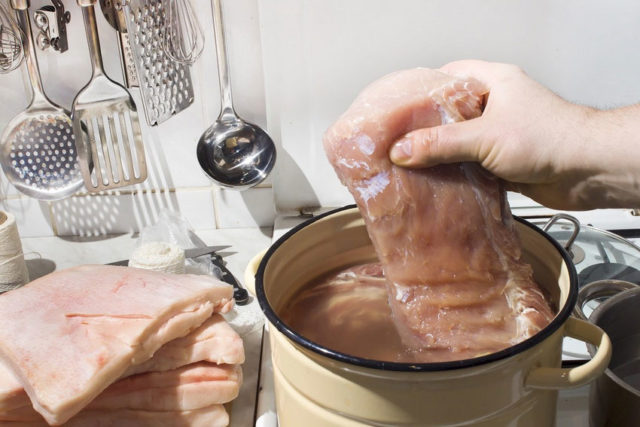 - Када се месо потпуно посоли, пошаљите га у лонац воде загрејан на 90 степени.