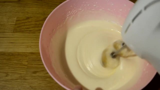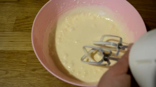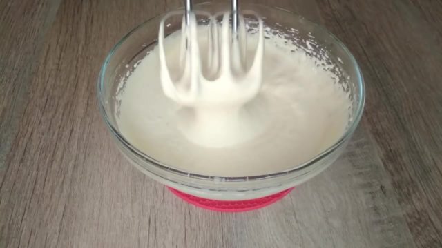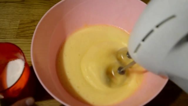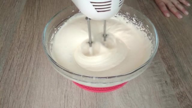 - Смеша јаја, шећера, ванилин мора се тући миксером док се не добије бела пухаста маса.