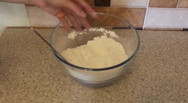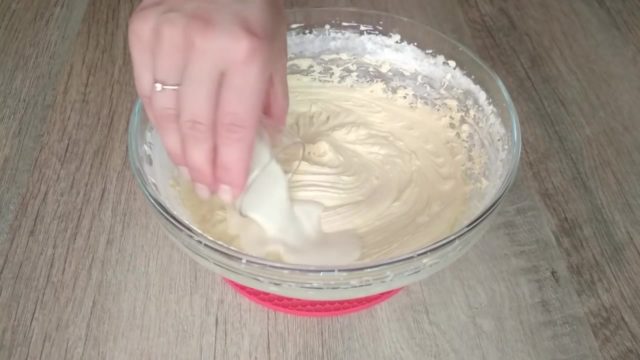 - Даље се додаје прашак за пециво или сода и такође се меша. После тога, морате додати брашно, темељито победити миксером, тако да нема грудвица, а тесто у конзистенцији подсећа на густу павлаку.