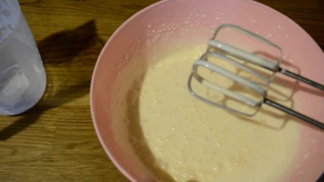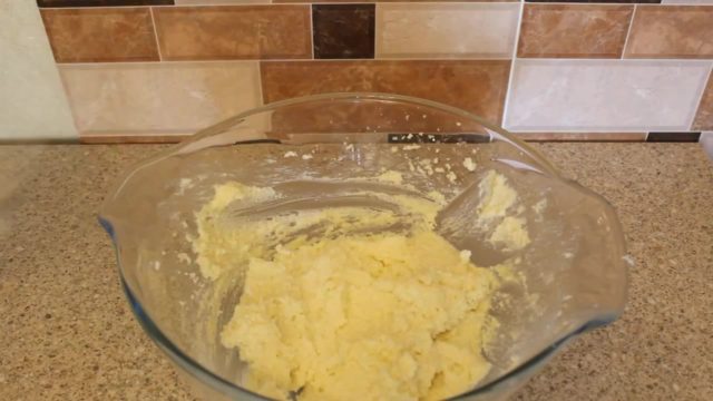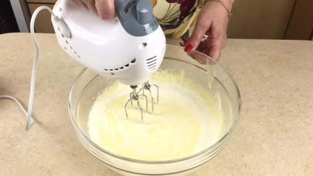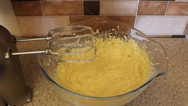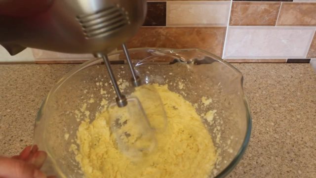 - Потребно је гнетити путер са гранулираним шећером, а затим додати јаја и побиједити добијену масу миксером.