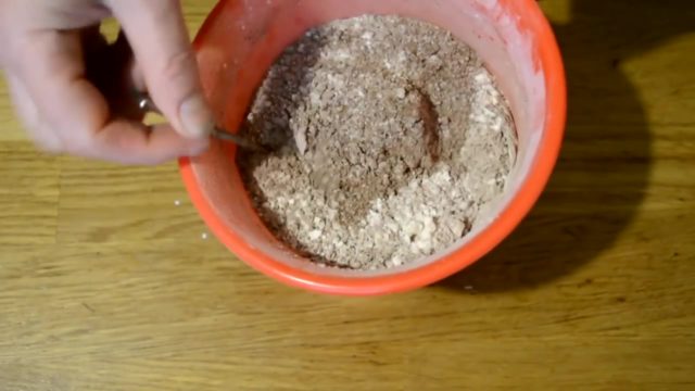 - Сува смеша се постепено сипа у смешу од јаја и уља и темељно се помеша шпатулом или кашиком.