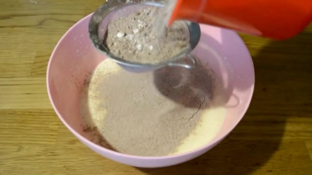 - У засебној посуди помешајте брашно, какао, ванилин и прашак за пециво.