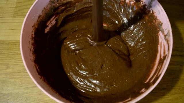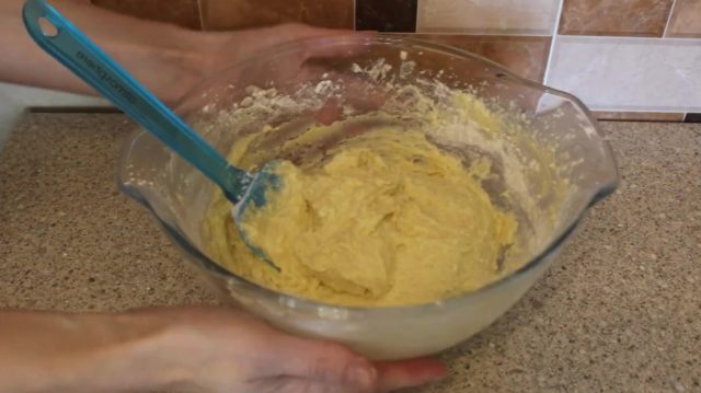 - Затим се млеко сипа у тесто, добијена смеша се помеша кашиком или шпатулом.