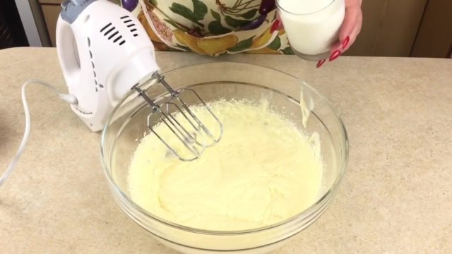 - Након што маса јаје-шећера почне да подсећа на кондензовано млеко у доследности, млеко се постепено сипа у посуду, без престанка рада миксера, и све компоненте се мешају.